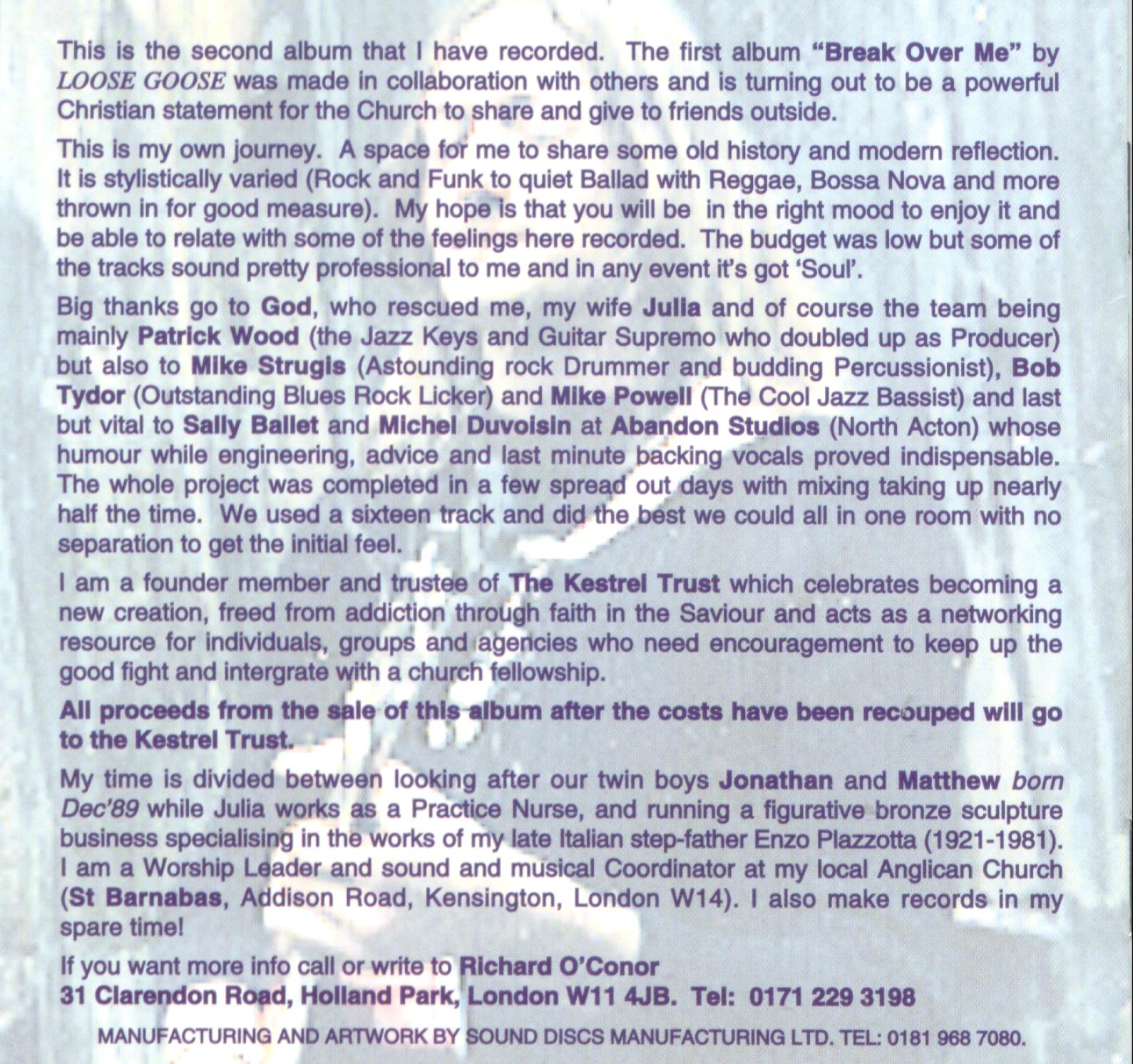 The above contact details have of course changed since this album was made in 1996. After seventeen years at St Barnabas Kensington I moved back to Holy Trinity Church, Brompton in 2003 AND then on to what is my local spire, St Dunstan's, East Acton. I am now also currently involved with the work of Prison Fellowship in Wormwood Scrubs Prison.